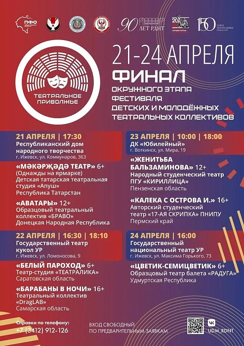 Финал VII сезона фестиваля «Театральное Приволжье» пройдет в Удмуртии21-24 апреля в Удмуртии пройдёт финал VII сезона фестиваля детских и молодёжных театральных коллективов «Театральное Приволжье». Один из финалистов – детский театр-студия «Театралика» из Саратова.