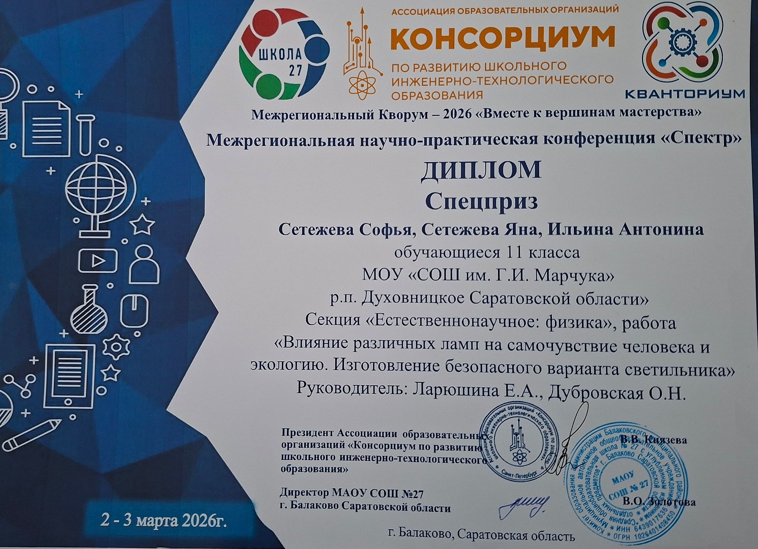 Межрегиональная научно-практическая конференция "Спектр".2 марта 2026 года обучающиеся ЦО естественно-научной направленности "Точка роста" МОУ "СОШ им Г.И.Марчука р.п. Духовницкое Саратовской области" Сетежева Софья, Сетежева Яна и Ильина Антонина и педагог дополнительного образования Дубровская О.Н. принимали участие в межрегиональной научно-практической конференции "Спектр". Данная конференция проводилась в рамках межрегионального Кворума -2026 "Вместе к вершинам мастерства" на базе Муниципального автономного общеобразовательного учреждения «Средняя общеобразовательная школа №27 с углубленным изучением отдельных предметов».