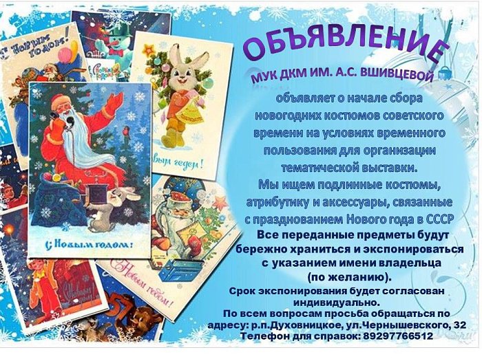 МУК «ДКМ им. А. С. Вшивцевой» объявляет сбор новогодних костюмов советского времени