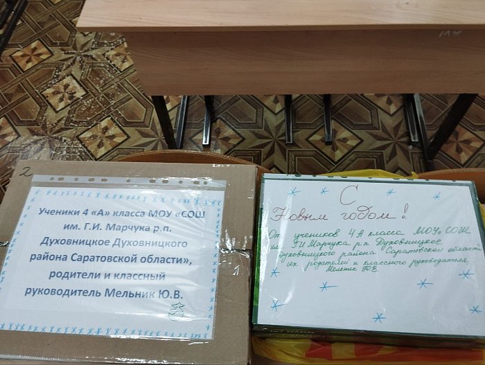 Новогодние подарки для наших защитников.Сердца учеников 4 «А» класса МОУ "СОШ им. Г.И. Марчука р.п. Духовницкое" наполнились желанием поддержать наших героев и поздравить их с наступающим Новым годом!