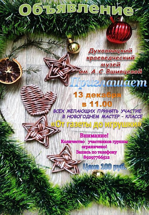 Объявление Духовницкий краеведческий музей им. А. С. Вшивцевой Приглашает 13 декабря в 11.00 Всех желающих принять участие в новогоднем мастер‑классе «От газеты до игрушки»