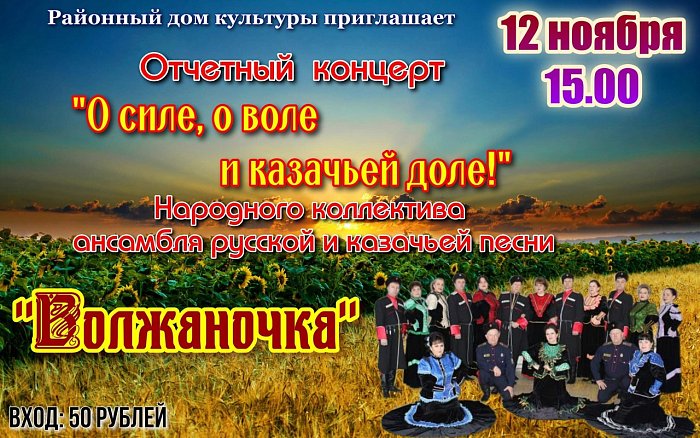 Районный Дом культуры приглашает 12 ноября 15.00 состоится отчётный концерт " О силе, о воле и казачьей доле!"