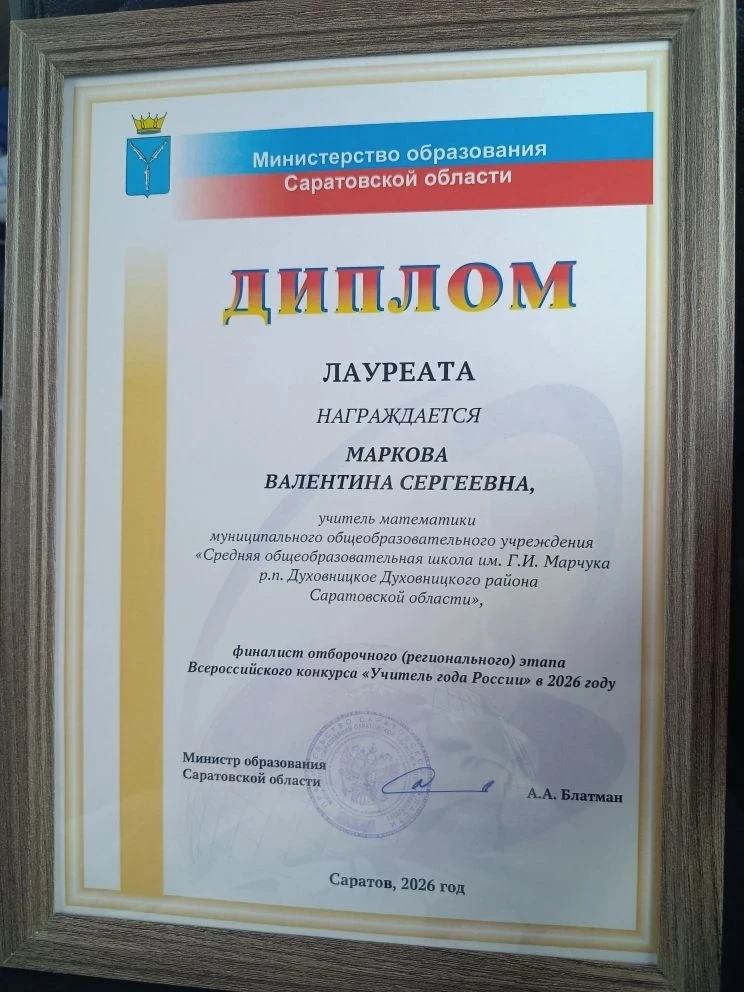 Духовницкий район в финале конкурса представила учитель математики Маркова Валентина Сергеевна МОУ "СОШ им. Г. И. Марчука р. п. Духовницкое" и стала ЛАУРЕАТОМ регионального отборочного этапа.