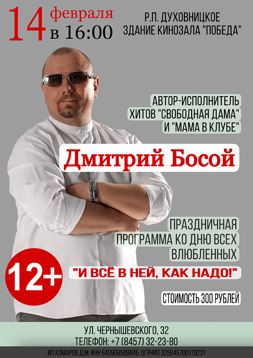 Специальный гость! На сцене – Дмитрий Босой, автор и исполнитель нашумевших хитов "Свободная дама" и "Мама в клубе"! Участник всеми любимого музыкального Шоу Андрея Малахова "Песни от всей души" !